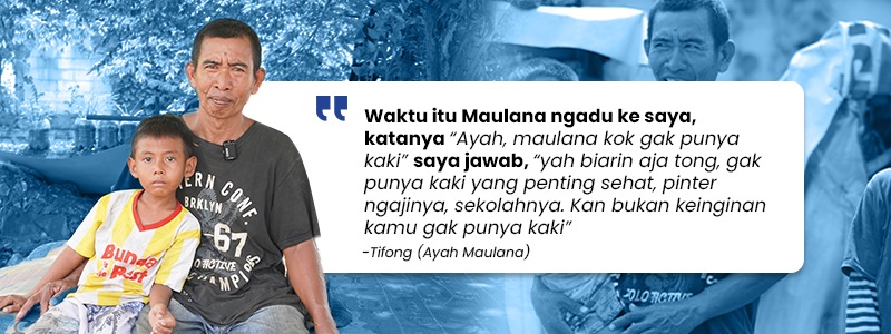Maulana dulu sempat memiliki kaki palsu bantuan, tapi kini sudah tak muat lagi. Ia tumbuh, sementara kaki palsunya tidak. Tanpanya, ia hanya bisa duduk di rumah, menatap teman-temannya berlari dan bermain dari kejauhan.